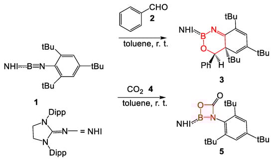 Recently, Liu et al. [6] suggested that BN-substituted π-conjugated systems may be versatile species participating in formal Diels-Alder reactions, given that enynes have been well documented as the diene component for [4+2] cycloaddition reactions with alkenes [7,8,9]. Thus, when B-(N-heterocyclic imine) N-aryl iminoborane 1 was treated with benzaldehyde 2 in toluene at room temperature, the fused bicyclic compound 3 was obtained with a yield of 97% (see Scheme 2) [6]. On the other hand, when the N-aryl iminoborane 1 was treated with CO2, the four-membered heterocyclic 5 was obtained with a yield of 65% (see Scheme 2).