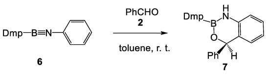 Interestingly, when N-phenyl iminoborane 6, which has no substitution at the ortho positions of benzene, was treated with benzaldehyde 2, the aromatic compound 7 was obtained with a yield of 97% (see Scheme 3) [6]. Formation of the aromatic compound 7 was explained by a hydrogen shift from the ortho position of the formal [4+2] cycloadduct to the imino nitrogen atom.