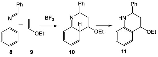The reaction between an N-aryl imine 8 and a nucleophilic ethylene 9 in the presence of a Lewis acid, known as the Povarov reaction [10], has become a powerful tool for the construction of the 1,2,3,4-tetrahydroquinoline (THQ) structure (see Scheme 4). Povarov reactions are domino processes involving two consecutive reactions: (i) a Lewis acid (LA) catalyzed aza-Diels-Alder (A-DA) reaction between an N-aryl imine 8 and a nucleophilic ethylene 9 giving a formal [4+2] cycloadduct 10; and (ii) a subsequent 1,3-hydrogen shift in 10 yielding the final THQ 11, with regeneration of the aromatic ring [11].