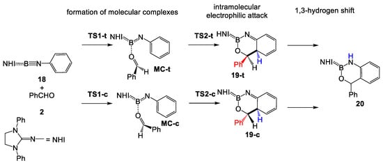 From these MCs, the subsequent electrophilic attacks of the activated carbonyl C6 carbon of benzaldehyde 2 on the ortho C5 carbon of the phenyl substituent of N-phenyl iminoborane 18 have low activation Gibbs free energies of 6.2 (TS2-c) and 2.6 (TS2-t) kcal·mol−1. From the separated reagents, the formation of the fused bicyclic compounds 19-c and 19-t is exergonic by 6.8 and 4.6 kcal·mol−1, respectively. Finally, a subsequent formal 1,3-hydrogen shift converts the fused bicyclic compounds 19 into the aromatic compound 20. This process is strongly exergonic by 39.4 kcal·mol−1 as a consequence of the regeneration of the aromatic ring of the phenyl substituent. Due to the strain associated with this intramolecular 1,3-hydrogen shift process, it has a very high activation energy [26], and consequently, this tautomerization requires an external acid/base species [27].