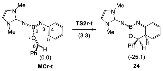 Step of the electrophilic attack of the carbonyl C6 carbon on the ortho C5 carbon of the phenyl substituent of N-phenyl iminoborane 23. Relative energies in toluene are given in parentheses in kcal·mol−1.