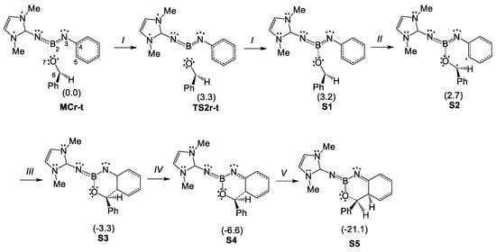 The activation Gibbs free energies associated with the formation of the MCs are 15.8 (TS1-c) and 16.7 (TS1-t) kcal·mol−1, their formation being endergonic by 14.9 (MC-c) and 17.2 (MC-t) kcal·mol−1. The very high endergonic character of these MCs means that they cannot be considered reaction intermediates. Note, however, that the formation of these MCs is necessary for the electrophilic activation of the carbonyl C6 carbon of benzaldehyde 2 for the subsequent electrophilic attack to the phenyl substituent of N-phenyl iminoborane 18.