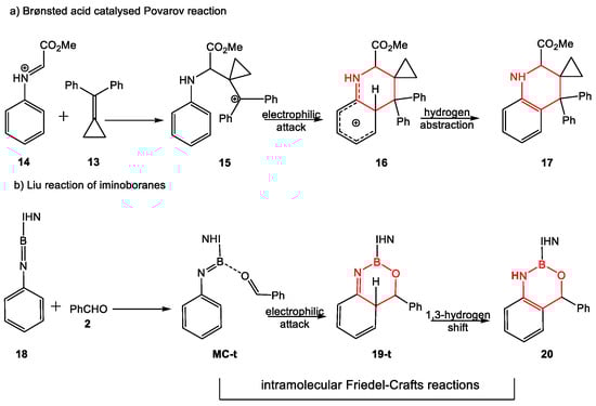 Formation of the fused aromatic compound 20 is a domino process that comprises three consecutive reactions: (i) formation of a weak molecular complex MC-t between the N-phenyl iminoborane 18 and benzaldehyde 2; (ii) an intramolecular electrophilic attack of the activated carbonyl carbon of benzaldehyde on the ortho position of the N-phenyl substituent yielding the fused bicyclic compound 19-t; (iii) and a formal 1,3-hydrogen shift yielding the final fused aromatic compound 20. The two last reactions of this domino process correspond to an intramolecular Friedel–Crafts acylation reaction, the fused bicyclic compound 19-t of the second reaction being the tetrahedral intermediate of a SEAr reaction. The presence of the imino N3 nitrogen adjacent to the aromatic ring strongly stabilizes the tetrahedral compound 19-t, being obtained as the reaction product when the ortho positions of the phenyl substituent are occupied by t-butyl groups. This domino reaction shows a great similitude with the mechanism of the Brønsted acid-catalyzed Povarov reactions (see Scheme 11).