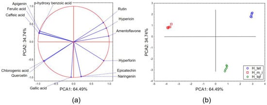The results of principal component analysis applied to the dataset describing the quantities of evaluated secondary metabolites in the analyzed extracts show that the first two principal components (PCAs) describe more than 99% of the sample’s variability. In terms of the first principal component (PCA1), most of the variability is described by the quantified amounts of hypericin, hyperforin, rutin, amentoflavone and phenolic acids (ferulic, caffeic and p-hydroxybenzoic acid) (Figure 1a). The shape of the recorded variability in terms of the second principal component (PCA2) mostly correlates with the quantified amount of gallic acid. The position of the evaluated extracts in the space defined by the first two principal components (Figure 1b) shows a grouping of H. tetrapterum (H_tet) and H. triquetrifolium samples (H_tqf) in the positive part of PCA1 as a result of the higher recorded amount of hypericin, hyperforin, rutin and amentoflavone. The separative grouping of H_tet and H_tqf samples in terms of PCA2 is a result of higher amounts of epicatechin and naringenin in H_tqf samples and the dominance of hypericin, rutin and amentoflavone in H_tet samples. H. maculatum ssp. immaculatum (H_m_i) samples are located in the negative part of PCA 1 as a result of the moderate quantified amount of rutin, hypericin and hyperforin, but the higher abundance of caffeic, p-hydroxybenzoic and ferulic acids.