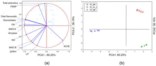 Figure 2. PCA—biological potential: (a) PCA loadings, (b) the position of the evaluated extracts in the space defined by the first two principal components (PCAs).
