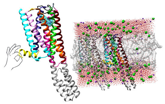 Left: The crystal structure of 5-HT2AR in complex with LSD (as deposited at PDB, https://www.rcsb.org/, PDB ID: 6HWT [16], accessed on 1 December 2022). LSD is depicted in blue encircled by the transparent sphere, TM1 (residues 69–101) is colored in blue, TM2 (residues 111–137) is depicted in plum, TM3 (residues 114–179) is painted in orange, TM4 (residues 188–217) is colored in lime green, TM5 (residues 231–265) is depicted in dark red, TM6 (residues 315–349) is painted in violet-red, TM7 (residues 353–383) is colored in dark grey, intracellular amphipathic helix H8 (residues 384–399) is depicted in yellow, two intracellular loops ICL1 and ICL2 (residues 102–111 and 179–187) are illustrated in cyan and hot pink, respectively, three extracellular loops ECL1, ECL2, and ECL3 (residues 134–138, 218–230, and 350–352) are labeled in gold, dim gray, and dark slate gray, respectively; Right: The crystal structure of 5-HT2AR immersed into dipalmitoylphosphatidylcholine (DPPC) lipid bilayer (as deposited at OPM, https://opm.phar.umich.edu/, entry: 4282, accessed on 2 March 2023): the DPPCs are illustrated with transparent gray spheres, oxygen atoms from water molecules are colored in red, sodium atoms are presented as pink spheres, and chlorine atoms are described as green spheres. For the clarity of the presentation, hydrogen atoms were omitted.