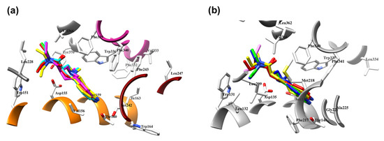 The docking assessment of LSD co-crystallized into 5-HT2AR (the 6WGT crystal [16]), EC conformation in pink, ECRD conformation in blue, RCRD conformation in green, ECCD conformation in red, and RCCD conformation in yellow (a); LSD co-crystallized into 5-HT2BR (the 5VNT crystal [31]), EC conformation in pink, ECRD conformation in blue, RCRD conformation in green, ECCD conformation in red, and RCCD conformation in yellow (b).