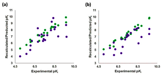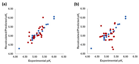 Experimental versus recalculated (blue circles) and predicted (red circles) pKis for TR using OH2 probe BOTH (STE + ELE) LOO model at 5 PCs (a); OH2 probe BOTH (STE + ELE) LSO model at 5 PCs (b).