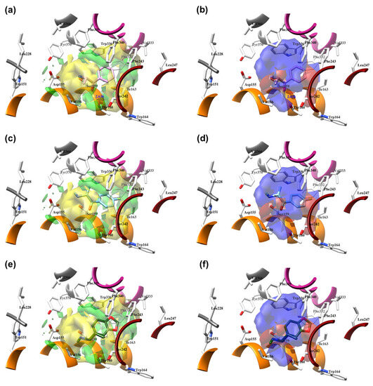The structure-based alignment within 5-HT2AR-DPPC and OH2 probe-based PLS-coefficients (positive steric coefficients presented in green, negative steric coefficients depicted in yellow, positive electrostatic coefficients portrayed in red, negative electrostatic coefficients displayed in blue) for 4 (a,b), 9 (c,d), and 18 (e,f). For the clarity of presentation, DPPC was omitted.