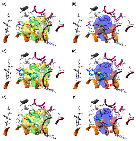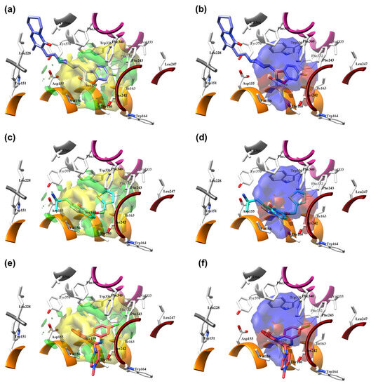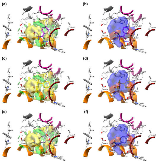 The structure-based alignment within 5-HT2AR-DPPC and OH2 probe-based PLS-coefficients (positive steric coefficients presented in green, negative steric coefficients depicted in yellow, positive electrostatic coefficients portrayed in red, negative electrostatic coefficients displayed in blue) for 1 (a,b); 2 (c,d); 17 (e,f). For the clarity of presentation, DPPC was omitted.