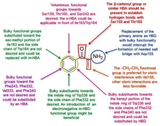 The benzene ring (Ph) of the SCs can be considered as a first pharmacophoric feature. Thus, the unsubstituted Ph (found in AGs 1, Figure 5a,b; 4, Figure 6a,b; 23, Figure S1a,b, and 24, Figure S2a,b, as well as within an IA 9, Figure 6c,d; Supplementary Materials, Table S2) was placed at the bottom of the hydrophobic cleft. Within the listed SCs, the Ph’s ortho-positions proximal to the β-carbonyl group (β-CO) orientation (see further discussion), according to the positive STE OH2PLS-coefficients maps, formed favorable steric interactions with Ser159, Thr160, and Ser242 side chains, implying that the additional bulkiness would be preferable for the agonistic pharmacology and likely the hallucinogenic effects. In contrast, the yellow STE OH2PLS-coefficients maps emphasized the unfavorable T-shaped (i.e., edge-to-face) van der Waals interactions of the opposite-side o-positions with the benzyl part of Trp336′s indole ring, as well as with Phe340, toward which bulkiness should be reduced, perhaps endowing lower psychostimulation.