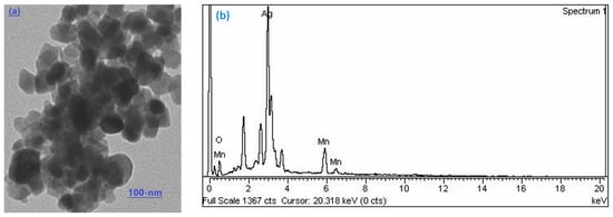 By plotting (αhv) 1/2 vs. hv, the extrapolation of a linear fit to the X-axis provides insights into the bandgaps (Eg). The application of a Tauc plot confirmed that the bandgap of the Ag-Mn nanoparticles was 1.23 eV, as visually depicted in Figure 10. This bandgap of 1.23 eV suggests that the prepared photocatalyst exhibits potential for visible-light utilization in photocatalytic processes [51].