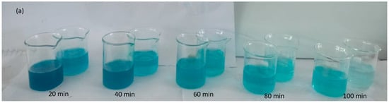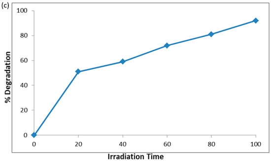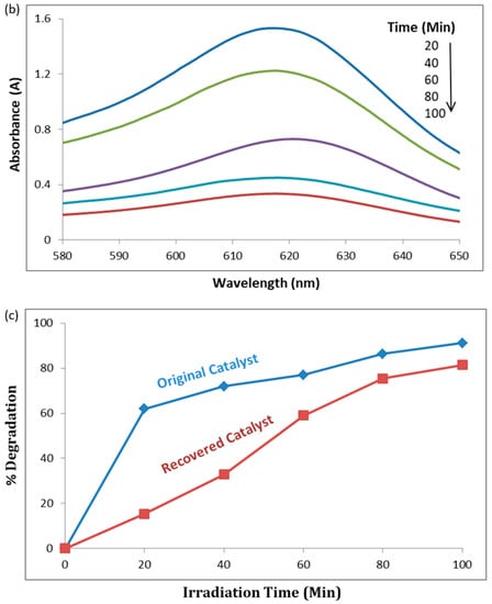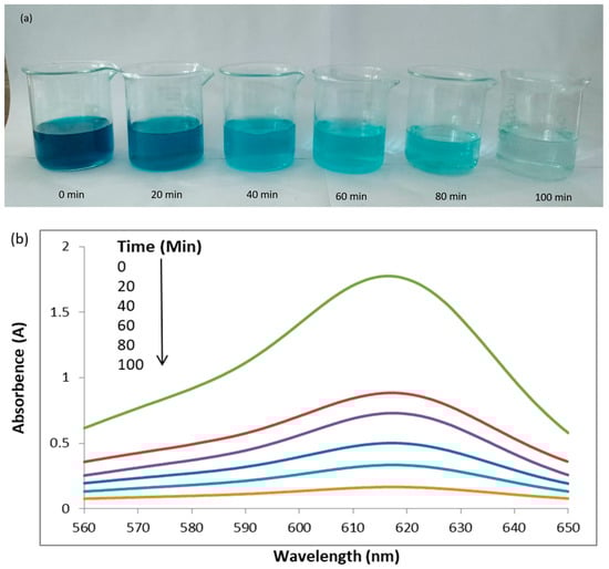 Aqueous solutions containing 25 ppm of MG dye were subjected to degradation by Ag-Mn oxide nanoparticles for different durations. Visual representations captured through photographic images depict the dilution and catalytic behavior of MG during its degradation process. These images show the evolution of MG’s appearance at different time intervals: 0, 20, 40, 60, 80, and 100 min (Figure 4a). Initially, at the start of the degradation process (0 min), the photographic image exhibits a deep and intense green that is characteristic of the unaltered MG dye. As the degradation process unfolds, an observable transformation occurs. At subsequent time intervals, spanning 20, 40, 60, 80, and 100 min, a significant change in the color of the dye becomes apparent. As time progresses, the color of the MG dye gradually shifts from a darker, more saturated hue toward a progressively lighter shade. This shift from dark to light coloration signifies the ongoing breakdown of dye molecules because of catalytic activity. The transition from an initially concentrated and intense color to a more subdued and lighter tone indicates the effective degradation of MG into simpler molecular components.