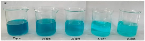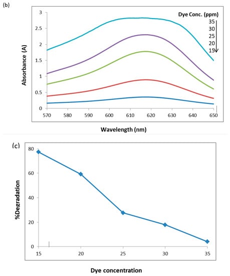 To assess the impact of the MG dye concentration on the photocatalytic degradation process, the initial dye concentration was varied within the range 15–35 ppm. The study aimed to determine a suitable dye concentration while maintaining a constant amount of catalyst (0.0003 g) for a duration of 60 min. The photographic images capture the dilution phenomenon occurring within solutions of MG dye at varying concentrations: 15, 20, 25, 30, and 35 ppm, as depicted in Figure 5a. These images provide a visual representation of the dye’s behavior after undergoing degradation for a fixed duration of 60 min. Starting with the 15-ppm dye solution, the photographic image displays the color and intensity of the dye in its original state. As the dye concentration increases incrementally to 20 ppm, 25 ppm, 30 ppm, and 35 ppm, each subsequent image portrays a gradually deepening and more concentrated coloration. The degradation process, which takes place over the course of 60 min, induces changes in the appearance of the dye solutions. The photographic images capture this alteration, show the progressive reduction in the dye’s vibrancy and color intensity across the range of concentrations.