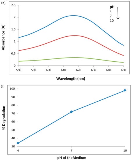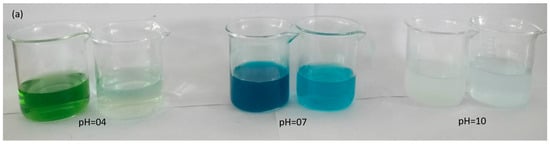 The pH of the chemical reaction system plays a critical role in determining the surface properties of the solid catalyst and the characteristics of the dissolved ions. It exerts significant influence, making it a crucial factor to consider [23]. The degradation of dye is influenced by the pH of the solution, as effluents from various industries, such as dyes, paints, and textiles, are released at different pH levels. Therefore, the impact of pH on the degradation rate of the dye was examined at pH 4, 7, and 10. The pH level plays a crucial role in the photodegradation process of textile waste and the generation of hydroxyl radicals. The comparative photographic images capture the transformation of the original solutions before and after degradation at different pH levels: 4, 7, and 10 (Figure 6a). The arrangement of the images highlights the distinct changes in color and appearance between the predegradation and postdegradation states. On the left side of each paired image, the original solutions are depicted before the degradation process. These solutions are characterized by their initial dark and intense coloration, which represents the unaltered state of the dye at the respective pH levels. The darkness of the color indicates the concentration and vibrancy of the dye molecules present in the solution. Conversely, on the right side of each image pair, the solutions are shown after degradation at the specified pH levels. In these images, the color of the solutions appears notably lighter and less intense compared to their original state. This change in color is a direct result of the photocatalytic degradation process that the dye molecules have undergone.