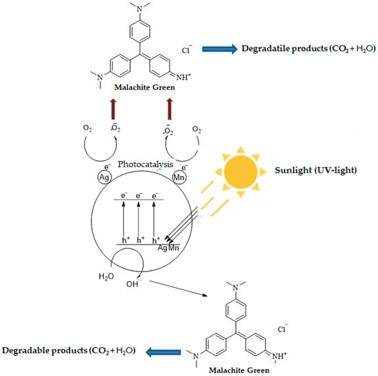 Photocatalytic degradation typically involves multiple stages, including adsorption–desorption, the generation of electron–hole pairs, recombination of these pairs, and chemical reactions [24]. However, the photocatalytic degradation of MG molecules comprises three primary steps: (1) efficient adsorption of MG molecules, (2) substantial absorption of incident light photons, and (3) initiation of charge-transfer reactions leading to the generation of oxidizing and reducing radicals [25]. Figure 9 shows the proposed mechanism for the photocatalytic degradation of the organic compound, malachite green dye.