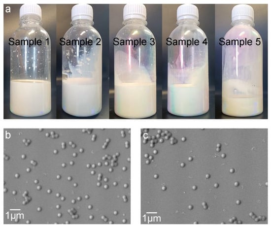Photographs and SEM images of SA latices. (a) Photographs of SA latices (sample 1 to sample 5 from left to right); (b) SEM image of SA latex particles with 4% GMA; and (c) SEM image of SA latex particles with 6% GMA.