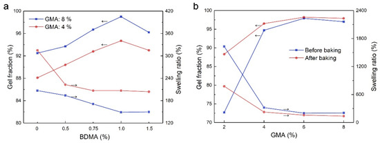 The gel fractions and swelling ratios of SA latex films. (a) Influences of BDMA dosage on the gel fraction and swelling ratio of SA latex films; (b) influences of GMA dosage on the gel fraction and swelling ratio of SA latex films.