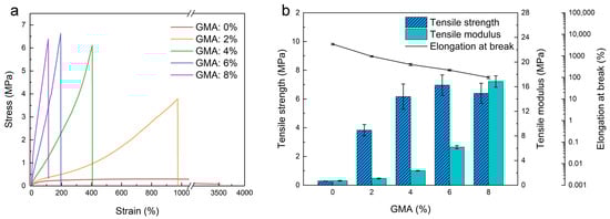 Tensile tests of SA latex films with different GMA dosages. (a) Stress–strain curves; (b) influences of GMA dosage on the tensile strength, modulus, and elongation at break.