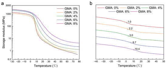 The mechanical properties of the latex films are important since they determine the mechanical performance of EFFTs. Figure 3a depicts the stress–strain curves of the latex films in a uniaxial tensile, showing a brittle fracture except for sample 1 without GMA. Based on Figure 3a, the tensile strength, tensile modulus, and elongation at break are obtained and plotted in Figure 3b. When the GMA dosage increases from 0 to 8%, the tensile strength increases gradually to the highest value at a GMA dosage of 6%, and then levels off, while the tensile modulus rises gradually to 16.13 MPa, and the elongation at break decreases quickly from 3390% to about 100%. This indicates that the formation of a denser crosslinking network structure at high GMA dosages increases the stiffness and brittleness of the films. The highest tensile strength (6.97 MPa) at a GMA dosage of 6% and a decreased tensile strength (6.39 MPa) at a GMA dosage of 8% imply that excessive crosslinking further enhances brittleness and reduces the strength of the film. The main reason for the loss in strength is that the polymer chain segment between the crosslinking points is too short to change the conformation, such that the polymer chain is severely restricted to deform under loading, leading to a premature fracture. As a result, the crosslinking reaction between the epoxy group and the carboxyl group could significantly improve the mechanical robustness and strength of the films. To meet the flexibility and strength requirements of the EFFTs, the suitable GMA dosage should be in the range of 4% to 6%.