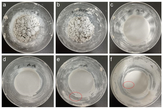 We then investigated the influence of AA dosage on the processability of the wet mixture, which is typically formed from 100 g of mineral powder, 15 g of SA latex, and 20 g of deionized water. As shown in Figure 5, the wet mixtures using different latices present diverse dispersion states, which seriously affect the processability. At AA dosages of 0 and 1%, the mineral powder absorbed the latex and water severely and agglomerated seriously (see Figure 5a,b) to lose mobility. Additionally, 30 g of extra water must be included in the wet mixtures to gain adequate processability for forming an EFFT, while at AA dosages of 2% and higher the mineral powder uniformly dispersed in the wet mixtures with good mobility (see Figure 5c–f). This is because the carboxylic latex particles adsorbed on the surface of the mineral powder provide electrostatic repulsion to drive the mineral powder dispersion and form a hydration layer on the surface of the mineral powder with a lubricating function [41]. This being the case, the carboxyl groups play important roles in the fabrication of an EFFT, including promoting dispersion, reducing water consumption during the mixing process, and shortening the baking time. However, at very high AA dosages (4% and 6%) there are lots of bubbles (indicated by red circles; see Figure 5e,f) in the wet mixtures because of the rather high viscosity of the latices.