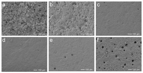The photographs and SEM images of the self-leveling surfaces of EFFTs formed from the wet mixtures are shown in Figure S5 and Figure 6, respectively. At low AA dosages (0 and 1%), 150% more water must be added into the wet mixtures to promote dispersing and processing compared to those of other systems. As a result, the obtained EFFTs had scratches and a large number of small cracks at the surfaces (see Figure S5a,b), which are caused by the volume shrinkage during the baking process. In the corresponding SEM images (see Figure 6a,b) it is observed that the mineral powder particles naturally accumulate together and wide gaps emerge between the particles, suggesting that the obtained EFFTs are quite loose and that the mineral powder particles are easily pulled off from the surface. Increasing AA dosages to 2% and more, the formed EFFTs display quite smooth surfaces (see Figure S5c–f), and the gaps between the powder particles are filled with a polymer binder (see Figure 6c–f) to form a compact microstructure. However, if AA dosages are too high (4% and 6%), air bubbles in the wet mixtures would remain, forming excessive pores in the EFFTs after baking treatment (see Figure 6e,f). Taking into account the processability of the wet mixture and the microstructure of the EFFTs, the optimum dosage of AA should be in the range of 2% to 3%.