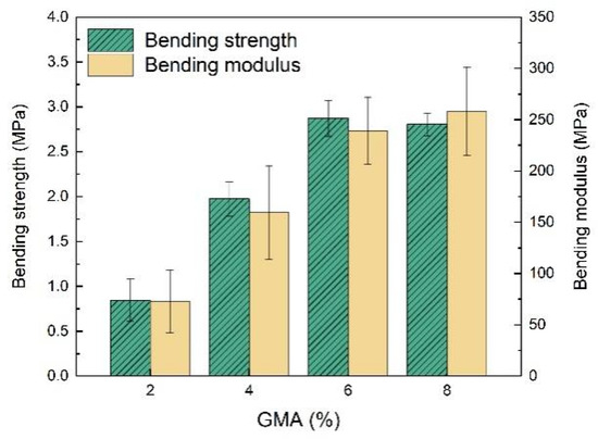 The mechanical properties of the resulting EFFTs with different dosages of GMA were determined via the three-point bending test. As shown in Figure 9, both the bending strength and bending modulus of the EFFTs improve as more GMA polymerized into the latices, except for the bending strength at a GMA dosage of 8%, which are basically consistent with those of the latex films (see Figure 3b). Therefore, the mechanical performances of the EFFTs are highly dependent on the polymer binders. If non-crosslinkable latex was used as the binder, the formed EFFT had both a low bending strength and a low bending modulus. For example, the abovementioned EFFT of sample 8 latex had a low bending strength of 0.5 MPa and a low bending modulus of 20 MPa.