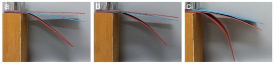 Self-supporting performance of two commercial EFFTs (red) and our EFFT (blue) at different temperatures: (a) 0 °C; (b) 25 °C; and (c) 40 °C.