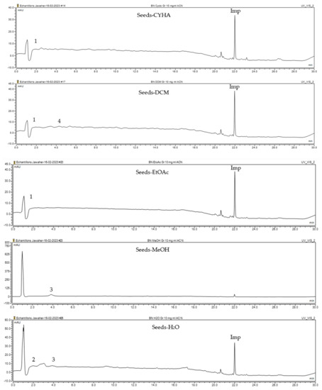 The maceration method was used to extract the secondary metabolites from rutabaga seeds. Twenty grams of rutabaga seed were extracted continuously for 2 h with moderate agitation with increasing-polarity organic solvents: CYHA, DCM, EtOAc, MeOH, and H2O (sample to solvent ratio of 1:10 (w/v)) at room pressure and temperature. Filtered extracts were concentrated via distillation in a rotary evaporator under vacuum with reduced pressure at 35 °C (IKA, RV 10 auto V, Germany). The following formula was used to determine the extraction yield: