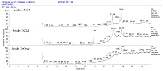 GC-MS chromatograms of rutabaga seed extracts (CYHA: cyclohexane, DCM: dichloromethane, EtOAc: ethyl acetate).
