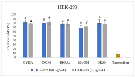 Cell viability of HEK-293 after 48 h treatment with 50 µg/mL and 5 µg/mL of rutabaga seed extract. Tamoxifen was tested at 100 µM. Results are mean ± SD (n = 3). The histograms’ different letters indicate significant difference according to Tukey’s test (p ≤ 0.05).