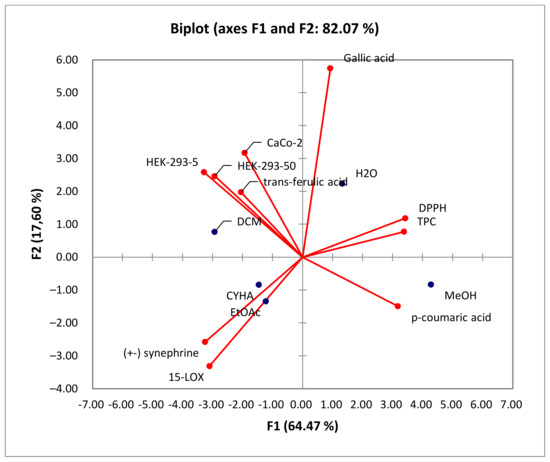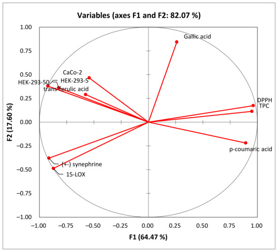 In the PCA loading plot, the loadings reflect both the correlation of the principal components with the original variables and the correlations between the different activities and total phenolic content and the identified phenolic compounds. Based on the information provided in Table 5, several correlations can be observed. PC1 was strongly correlated with TPC, DPPH, and p-coumaric acid, with 0.950, 0.963, and 0.893, respectively. Conversely, PC1 exhibited negative correlations with the level of anti-inflammatory activity (15-LOX) (r = −0.872), cytotoxic activity against HEK-293 cells (r = −0.823 and r = −0.923) and Caco-2 cells (r = −0.543), (±) synephrine (r = −0.914), and trans-ferulic acid (r = −0.577). Additionally, PC2 was well correlated with gallic acid, with a loading of 0.844. For the PC3, there was a good positive correlation with the cytotoxicity against Caco-2 cells and trans-ferulic acid with loadings of 0.699 and 0.764, respectively.