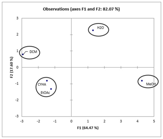 Principal components analysis “score plot” of rutabaga seed extracts (CYHA: cyclohexane, DCM: dichloromethane, EtOAc: ethyl acetate, MeOH: methanol, water: H2O).
