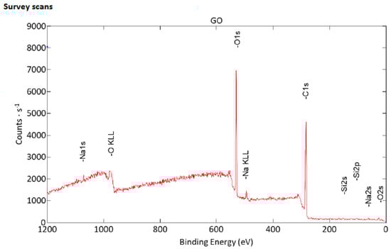Results of the XPS survey of the GO sample are shown in Figure 1. Carbon and oxygen were the most common components of the surface composition at 96.8 atomic %. Some residues were also found with low concentrations of nitrogen atoms found at 399.8 eV that due to the noisy signal could be erroneous, and spectra signals at 102.3 eV indicated the presence of silicone- and/or siloxane-type compounds or SiO2 [27,28]. Data also showed the signal characteristic for the presence of potassium ions at 293.2 eV, which can be residue from the potassium permanganate used in the modified hummers method that was used to produce the GO in the experiment [27,29,30]. Detailed results of surface composition determined by fitting XPS data are presented in Table 1. High-resolution spectra of GO are shown in Figure 2.