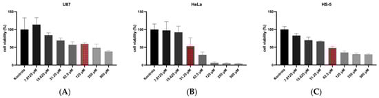 To determine the dose-response of cisplatin for a further experiment, an AlamarBlue assay was performed. The results are shown in Figure 3. Based on the AlamarBlue test, a 125 μM concentration of cisplatin was selected for the U87 cell line, 31.25 μM for HeLa, and 62.5 μM for HS-5 cells.