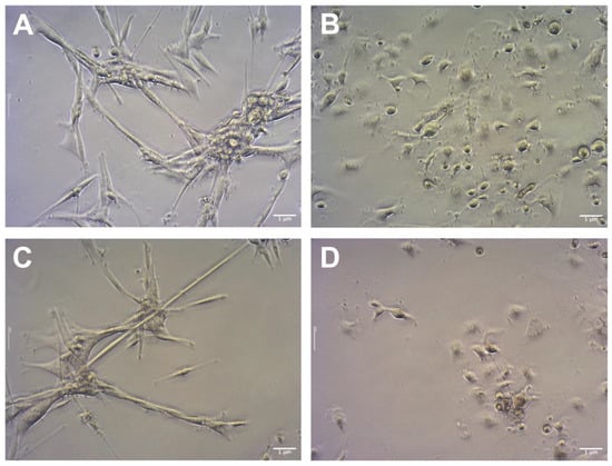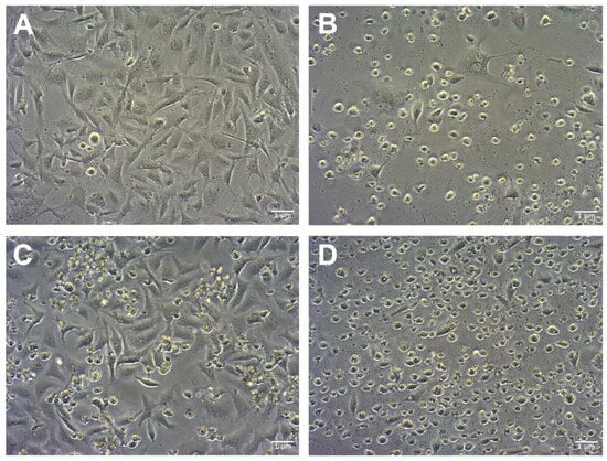 Comparison of HS-5 cells’ morphology: control (A); cells treated with cisplatin (B); cells pretreated with GO (C); cells pretreated with GO and treated with cisplatin (D). Scale bar 1 μm; 10× objective.