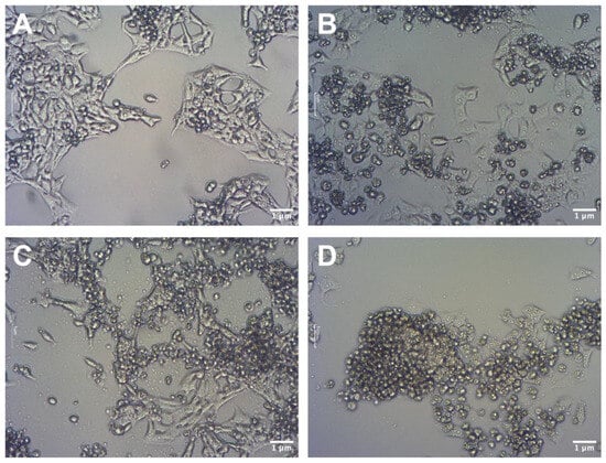 Comparison of HeLa cells’ morphology: control (A); cells treated with cisplatin (B); cells pretreated with GO (C); cells pretreated with GO and treated with cisplatin (D). Scale bar 1 μm; 10× objective.