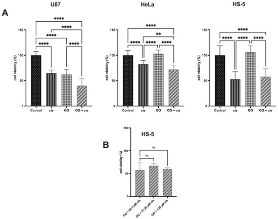 (A) Comparison of the viability of U87, HeLa, and HS-5 cells pretreated with GO, treated with cisplatin, and pretreated with GO that was given cisplatin after GO treatment. Control cells not treated with GO or cisplatin were used. (B) Comparison of different cisplatin concentrations on GO-treated HS-5 cells. Cisplatin concentrations were the same as used for the U87 (125 μM) and HeLa (31.25 μM) cell lines. Fluorescence measurement was used to read the results. Four asterisks (****) mean p-value ≤ 0.0001, two asterisks (**) mean p-value ≤ 0.01 and ns means result not statistically significant. Abbreviations: cis, cells treated with cisplatin in specific concentration for each line; GO, cells pretreated with 1 μg/mL GO; GO + cis, cells pretreated with 1 μg/mL GO and given cisplatin in specific concentrations for each line after GO treatment.