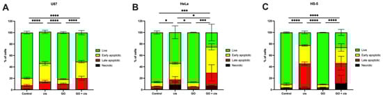 Both GO and cisplatin are known to cause apoptosis in many ways; the most common is reactive oxygen generation (ROS) dependent [34,35], and thus Annexin V/Propidium iodine apoptosis flow cytometry assay was performed. The results of the flow cytometry are presented in Figure 8. Table containing results of each assay can be found in the Appendix A. Apoptosis assay for U87 cells showed that GO pretreatment followed by cisplatin administration caused a significant decrease in live cells, to around 58%, compared to the control group. There was no significant difference between the groups treated with GO + cisplatin and the group treated with cisplatin. GO treatment followed by cisplatin significantly reduced live cells to around 58% compared to cells treated with GO (~81.5%). In both cisplatin-treated groups, late and early apoptotic cells were found. For HeLa cells, a significant decrease in live cell % was found between cells treated with just cisplatin and GO-pretreated cells that were given cisplatin—the percentages of live cells were around 54% and 25%, respectively. GO and cisplatin-treated cells had the lowest count of live cells than any other group. No significant change in live cell % was found between HS-5 cells treated with cisplatin and GO-pretreated cells that were given cisplatin. Live cell % reduced from around 91% in GO-pretreated cells to around 26% in GO + cisplatin-treated cells. In HeLa cells, the number of apoptotic cells increased after pretreatment with GO and cisplatin treatment, while in U87 apoptotic cells, the numbers are similar to those achieved only by cisplatin treatment. Simultaneously, U87 viability decreased after GO pretreatment and cisplatin treatment The results mentioned above suggest that U87 cells may undergo a different process compared to HeLa cells when it comes to cell death. This could be due to the mutated pten gene found in glioblastoma U87 cells [36], which is responsible for regulating cell growth, metabolism, and survival through the PI3K pathway [37,38]. Unlike U87, HeLa cells do have the wild type of pten and tp53, which allows them to perform apoptosis by a caspase-dependent pathway. Based on other authors’ results, it can be assumed that due to the pten loss cells switch on an alternative mechanism, instead of apoptosis, premature senescence, which also inhibits proliferation. A previously mentioned mechanism was used to explain decreased cell activity in glioblastoma U87 cells exposed to ionizing radiation [36].
