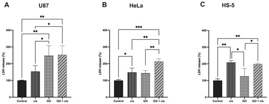 Comparison of the LDH release of U87 (A), HeLa (B), and HS-5 (C), showing cells pretreated with GO (GO), treated with cisplatin (cis), and pretreated with GO that were given cisplatin after GO treatment (GO + cis). Three asterisks (***) mean p-value ≤ 0.001, two asterisks (**) mean p-value ≤ 0.01 and one asterisk (*) means p-value ≤ 0.05. Abbreviations: cis, cells treated with cisplatin in a specific concentration for each line; and GO, cells pretreated with 1 μg/mL.