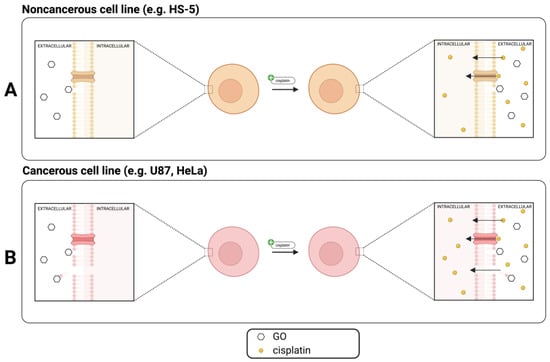 What is important from a further application perspective is that we reported that GO-pretreated cells of cancerous U87 and HeLa cell lines responded more strongly to cisplatin treatment than those that were just cisplatin-treated, based on AlamarBlue and/or Annexin V/PI and/or cell morphology analysis, resulting in a significant decrease in cell viability. The above suggests that low-dose GO pretreatment followed by cisplatin administration can reduce cancerous cells’ viability while at the same time not causing additional harm to noncancerous HS-5 cells Figure 7C,D and Figure 8). This phenomenon can be based on the difference in membrane potential of cancerous and noncancerous cells [43] and GO’s electrostatic and hydrophobic properties [44]. Previous studies showed that other carbon-based nanoparticles—for example, graphene quantum dots—can enhance the toxic cisplatin effect in the HeLa cell line [45]. We propose a GO membrane damage and cisplatin uptake mechanism, which is presented in Figure 10. Our proposed mechanism is in line with the mechanism described by Sui et al. and Perini et al. [45,46] and our experimental data. GO interacts with noncancerous cells, causing minor damage to the lipid membrane. Damage is not enough to alter the integrity of the lipid bilayer and does not allow cisplatin to enter the cell in any way other than using membrane transporters or passive diffusion (Figure 10A). In cancerous cells, GO damages the membrane making pores and altering permeability, allowing additional cisplatin inflow into the cells, resulting in cell death. We suggest that nanopores, which are formed after GO administration, are not lethal to the cells and allow cisplatin (as presented in our paper) or other drugs to enter cells, enhancing therapeutic effects.