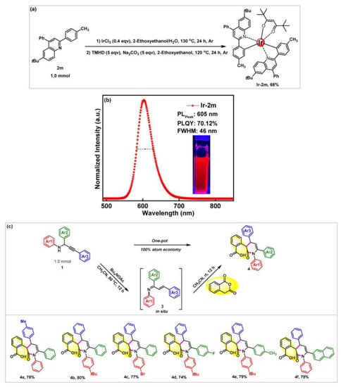 To further explore the synthetic utility of this protocol, we employed one of the quinoline 2m as the novel cyclometalated main ligand for constructing the highly efficient red phosphorescent iridium(III) complex Ir-2m, which shows bright red emission with a peak at 605 nm, high photoluminescence quantum yield (PLQY) of 70.12% and a small full width at half maximum (FWHM) value of 46 nm in CH2Cl2, illustrating the potential application in pure red OLED (Figure 1a,b and Figure S1) [45,46]. The application of various isomerization products was also explored. Several functionalized 1-azadienes synthesized in situ from propargylamines have been used to prepare a series of medicinally important dihydropyridin-2(1H)-ones (4a–4f) via a [4+2]-formal cycloaddition reaction with homophthalic anhydride under very simple reaction conditions with excellent functional tolerance and good yields (Figure 1c) [47,48].