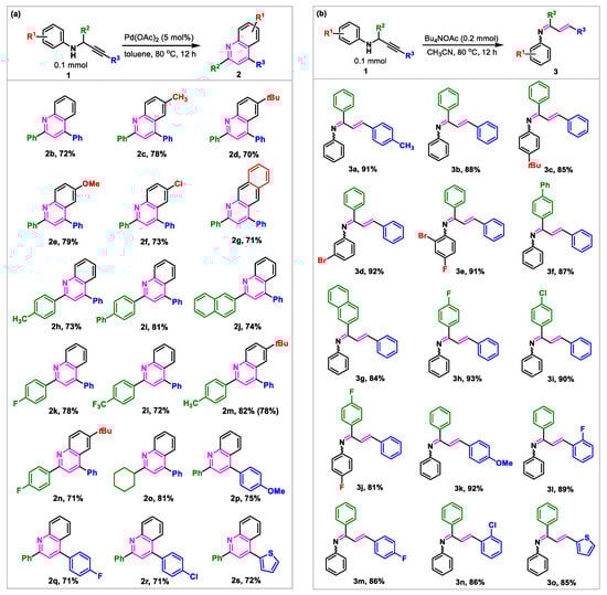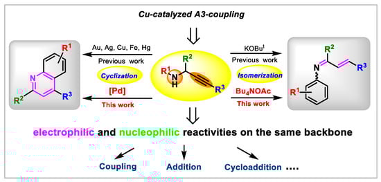 In this study, propargyalmine modules from the Cu-catalyzed A3-coupling of very simple and easily available ingredients, amines, aldehydes and alkynes, are employed for investigating new transformations [31,32,33]. By ingeniously modulating the reaction conditions, the highly selective cyclization and isomerization of propargylamine have been successfully implemented (Scheme 1). Using palladium catalyst, diverse quinolines are obtained, which are widely applicable in drug discovery and material science [34,35,36,37,38,39,40]. Alternatively, in the presence of a base, a series of synthetically valuable 1-azadienes has been smoothly prepared (Scheme 1) [41,42,43,44].