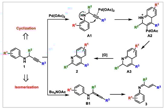 Based on the above experimental results and previous studies on the functionalization of propargylamines [19,20,21,22,23,24,25,26,27,28,29,30], we also proposed a plausible mechanism for the Pd or base promoting highly selective cyclization and isomerization of propargylamines, as depicted in Scheme 3. Initially, Pd(OAc)2 coordinates with the triple bond (A1) to enhance the electrophilicity of the alkyne part of the propargylamine. The subsequent intramolecular nucleophilic attack by the N-substituted aromatic ring generated intermediate A2. Protonolysis of the resulting intermediate A2 gives dihydroquinoline A3 and releases the palladium catalyst for a new cycle. Then, the generated dihydroquinoline was oxidized by O2 to afford the corresponding quinoline product 2. In the presence of Bu4NOAc, propargylamine 1 first forms allenic intermediate B1, which subsequently undergoes a prototropic isomerization to obtain 1-azadiene 3.