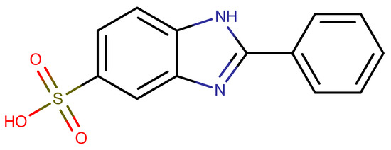 Structural formula of 2-phenyl-1H-benzo[d]imidazole-5-sulfonic acid (PBISA).