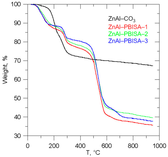 All of the intercalates decompose in three steps (see Figure 4): the first one corresponds to the interlayer water release, the second one to the release of water formed by condensation of hydroxyl groups and CO2 from the carbonate decomposition, and the third one to the decomposition of intercalated PBISA anions. The found and calculated weight loss values are given in Table S2 in the Supplementary Materials. The end product of the thermal decomposition is a mixture of ZnO (JCPDS No. 04-013-7122) and ZnAl2O4 (JCPDS No. 01-074-1136) [12] in the ratio corresponding to the Zn/Al ratio in the intercalate. As an example, the powder X-ray pattern of the ZnAl–PBISA–3 decomposition product is shown in Figure S1 in the Supplementary Materials.