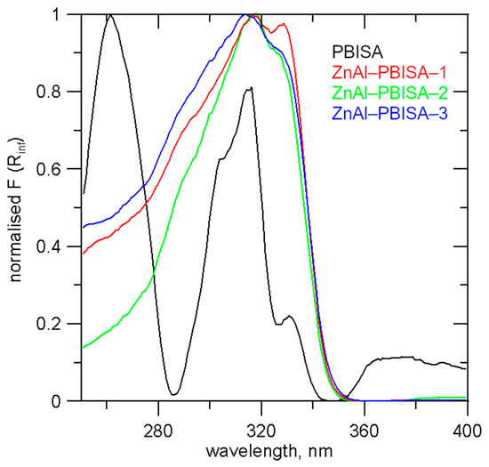 As was shown in [14], the UV-absorption spectra of PBISA are strongly influenced by the solvent used and the pH of the solution. UV-Vis spectra of the intercalates and pure PBISA measured in a mixture with Al2O3 are shown in Figure 6. Pure PBISA has a band with the highest intensity at 261 nm and three other intensive bands at 290, 316, and 330 nm. In the spectra of the intercalates, a very broad band with a maximum at 313–318 nm with a more or less distinct shoulder at about 329 nm can be observed.