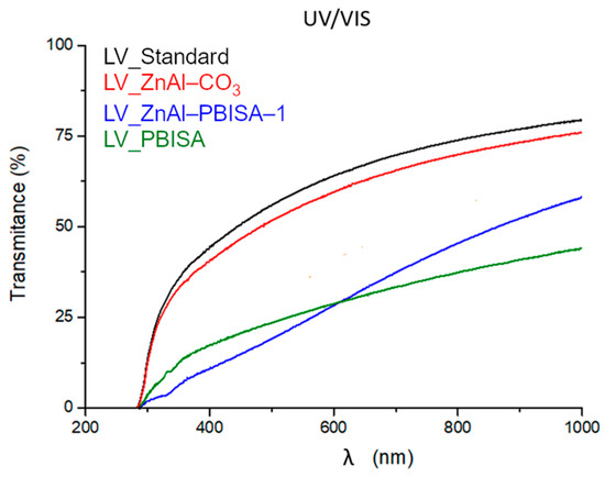 To compare the transmittance at individual wavelengths, transmittance averages between individual samples were compared. A statistical box plot is shown for 320 nm, corresponding to the border of UV-A and UV-B regions, where there is an absorption band of the fillers (Figure 9). It follows from the measured data that the sample with ZnAl–PBISA–1 has the highest absorption of radiation, i.e.., lowest transmittance, at the wavelength of 320 nm. The transmittance is at the level of one-tenth that of the standard foil without the filler. It is also worth noting the small deviations from the mean value, which indicates that the film properties are practically the same at all measured locations, which is consistent with the observed homogeneous distribution of the filler in the system. The developed UV absorber therefore exhibits higher radiation absorption/shielding compared to the organic molecule PBISA itself and, at the same time, significantly improves its compatibility with polyurethane-acrylate lacquer LV CC 220.