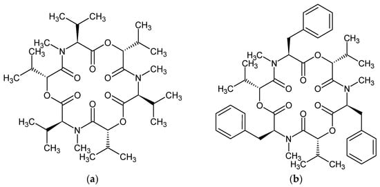- Ovchinnikov, Y.A.; Ivanov, V.T.; Evstratov, A.V.; Mikhaleva, I.I.; Bystrov, V.F.; Portnova, S.L.; Balashova, T.A.; Meshcheryakova, E.N.; Tulchinsky, V.M. The Enniatin Ionophoress. Conformation and ion binding properties. J. Pept. Protein Res. 1974, 6, 465–498. [Google Scholar]