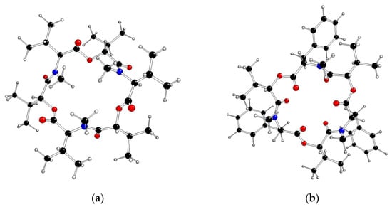 Symmetry, a common feature found in nature and chemistry, seems to bypass compounds produced by living systems. In general, high-symmetric organic molecules are toxic and highly carcinogenic. However, there are few types of biomolecules in plants and fungi that possess symmetry, such as the plant pigment curcumine (diferuloylmethane) with antioxidant, antibacterial, anti-inflammatory, and antitumor activity [,]. Among the small number of symmetric molecules produced by fungi, those of the Fusarium genus attract extensive attention due to their frequent contamination of food commodities, e.g., cereal grains [,]. They produce a number of secondary metabolites, which are questioned due to their potential health hazards [,]. Among them, enniatin B (ENB) and beauvericin (BEA) belong to the most studied mycotoxins due to their prevalent occurrence in cereals [,,]. Although toxic, they have shown numerous biological activities, including antibiotic, antimicrobial, insecticidal, anthelmintic, anticancer and apoptosis-inducing effects [,,,,,,,,,,].
